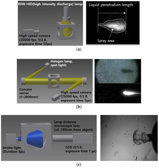 Schematic diagrams of the optical diagnostics setup are shown, with sample images, in Figure 2. Mie-scattering technique was used to capture the liquid spray development process. Spray development was captured by high speed camera (V7.1, Phantom, NJ, USA) at 20 kHz with exposure time of 10 μs. High intensity discharge (HID) lamp was used for illumination of spray as shown in Figure 2a. The recorded images contained mie-scattered light from fuel spray and other objects such as nozzle tip. To figure out the spray only from the image, background image was subtracted by fuel spray image. The pixel with more than 5% of the maximum brightness was defined as the spray region. Spray penetration length was defined as the distance from the nozzle tip to the farthest spray region from the nozzle tip. Spray cross sectional area was calculated by the integration of pixels of spray region. Optical setup and image processing used for mie-scattering in this study were same as reference [26].