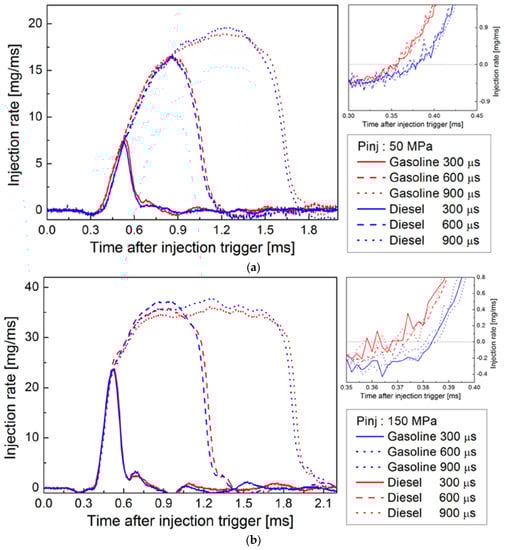 Injection rate characteristics of gasoline and diesel when injection duration command was varied as 300, 600, 900 μs: (a) Injection pressure: 50 MPa; (b) Injection pressure: 150 MPa.