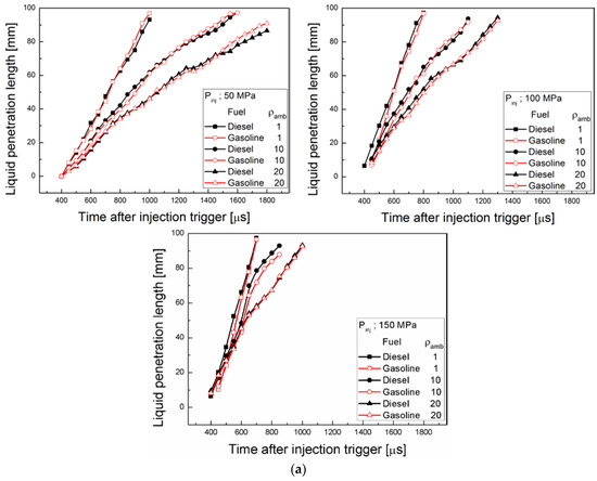 Figure 4 shows the quantitative analysis of liquid penetration length and spray cross-section area of gasoline and diesel with ambient density variation at fixed ambient temperature of 300 K. As shown in Figure 4a, liquid penetration length between diesel and gasoline was quite similar through all ambient density and injection pressures. This similarity of liquid penetration length under non-evaporating condition was also reported by Payri et al. and Kim et al. [14,25]. The rapid decrease of liquid penetration length with ambient density resulted from the spray momentum loss due to the increase of drag force. Momentum loss is proportional to the spray sectional area and spray velocity. Therefore, the narrower spray angle, the smaller drag force, so spray penetration length increases. The result that gasoline and diesel showed similar penetration length indicated that the spray angles of two fuels have no significant difference. Theoretically, the momentum of the spray is determined by the pressure difference between inside nozzle and ambient. Therefore, under the non-evaporating condition, two fuels have similar liquid penetration length in macroscopic view.