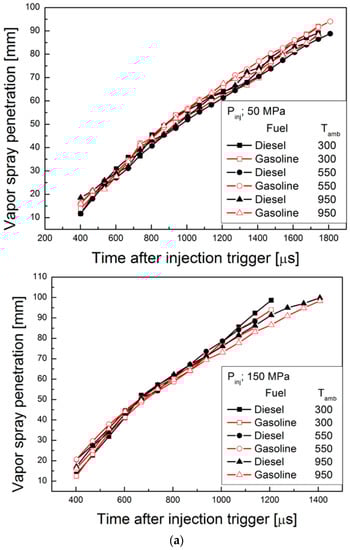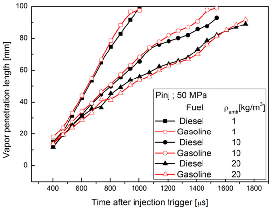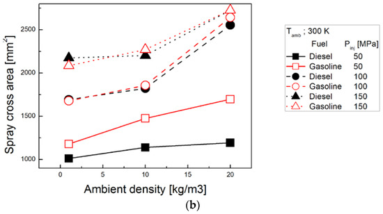 Figure 6a,b show vapor penetration length and spray cross-section area of gasoline and diesel according to ambient density variation. When comparing with vapor penetration length and liquid penetration length, it was observed that there was no significant difference between them. This was attributed to that evaporation rarely occurred under the room temperature condition. Spray cross sectional area was calculated at the point where spray penetration length reached 50 mm, center of the visualization window. Vapor penetration length for both fuels was decreased but spray cross-section area was increased with increase of ambient density. These are attributed to the increased drag force due to high ambient density. There was little difference between gasoline and diesel spray for penetration length and spray area as reported in Reference [26]. When injection pressure was increased, vapor penetration length was increased by the increased spray momentum. Vapor spray area was also increased with increased injection pressure.