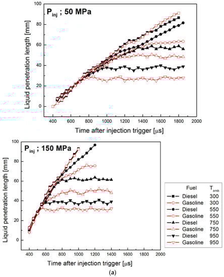 Figure 5a,b show the liquid spray length and spray cone angle of diesel and gasoline with ambient temperature variation. As the ambient temperature increased, significant differences in liquid spray development were observed between gasoline and diesel through all conditions. Maximum liquid penetration length is determined by the balance of the amount of spray propagation and spray evaporation. At the equilibrium penetration length, liquid spray head does not propagate more. Spray head location is fixed with disturbance fluctuation by turbulence. Liquid penetration length was decreased for both fuels as ambient temperature increased due to the vigorous evaporation at the spray head. Gasoline spray showed more significant decrease in penetration. This implies that larger amount of vaporization occurred at gasoline spray compared with diesel which resulted from the lower distillation temperature range of gasoline [26]. It is generally known that liquid penetration length is highly influenced by the fuel density and distillation characteristics. Liquid penetration length is dominantly governed by the T90 regardless of the numbers of fuel component [31]. Gasoline used in this study has lower T90 than diesel by about 200 K. In addition, as observed above, gasoline spray has the possibility of more air entrainment into the fuel spray compared with diesel spray, so evaporation should be promoted further.
