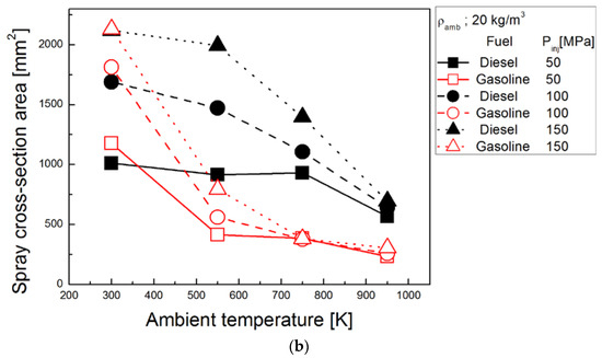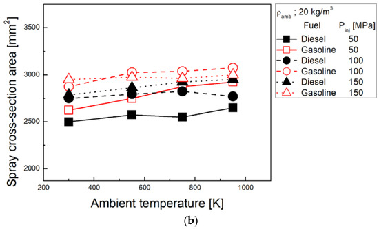 Figure 7a,b shows vapor penetration length and spray cross-section area of gasoline and diesel according to the ambient temperature. Interesting finding was that vapor spray penetration length was always similar regardless of ambient temperature at fixed ambient density. This indicated that the tip penetration of vapor spray was dominantly governed by ambient density not by ambient temperature condition. Vapor spray boundary was very similar between diesel and gasoline at fixed ambient density regardless of ambient temperature. Drag force to spray is the function of multiplying spray area, spray velocity and spray density. With similar spray angle and initial spray momentum, momentum loss was determined by the ambient density. It implies that entire spray boundary of gasoline and diesel is very similar under same ambient conditions and it is not affected by fuel distillation characteristics. Spray cross sectional area of gasoline was slightly bigger than that of diesel due to the slightly wider spray angle of gasoline spray. As stated in Section 3.2.1 liquid spray area, the liquid spray shape was quite different between two fuels due to the volatility.