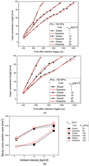 Vapor penetration length (a) and spray cross-section area (b) of diesel and gasoline, according to the injection pressure and ambient density.