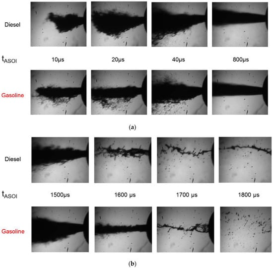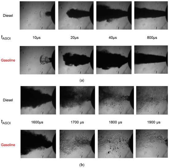 Microscopic spray development of gasoline and diesel at an ambient temperature of 550 K and ambient density of 20 kg/m3: (a) Initial spray development; (b) End of injection.