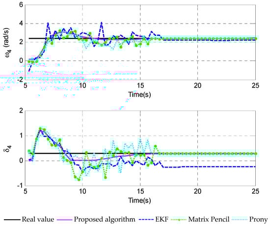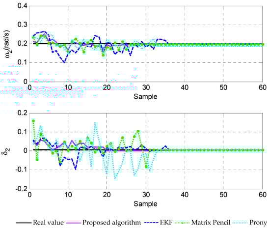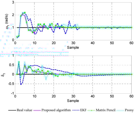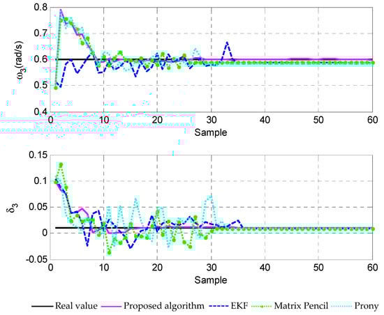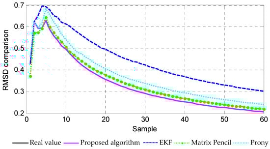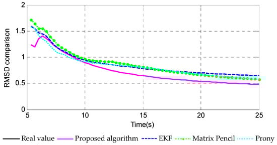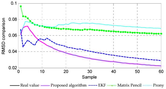 Figure 9 shows the estimated frequency and damping factor when using the proposed algorithm and other methods. Figure 10 illustrates the RMSD comparison of different methods. It could be found from these simulation results that, in this case, the proposed algorithm can estimate the parameters effectively with better convergence and steady state performance than EKF and other methods. Finally, the final identification results of other methods are also provided in Table 3, which demonstrate the superior performance of the proposed mehthod. Therefore, it can be concluded that the proposed algorithm possesses much more practical value than those shown in previous work.