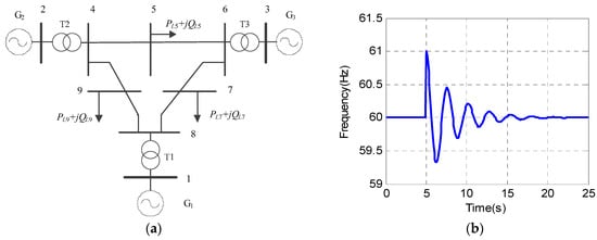 In this case, the WSCC model is taken as the test system [42], which has three generators and nine buses. The network is depicted in Figure 8a. The normal frequency of G2 is 60 HZ, at t = 5.1 s, the load at bus 5 is removed. This disturbance causes an inter-area sustained oscillation in G2 with the frequency of , and the damping factor is . Figure 8b presents the event recorded in the bus frequency signal.