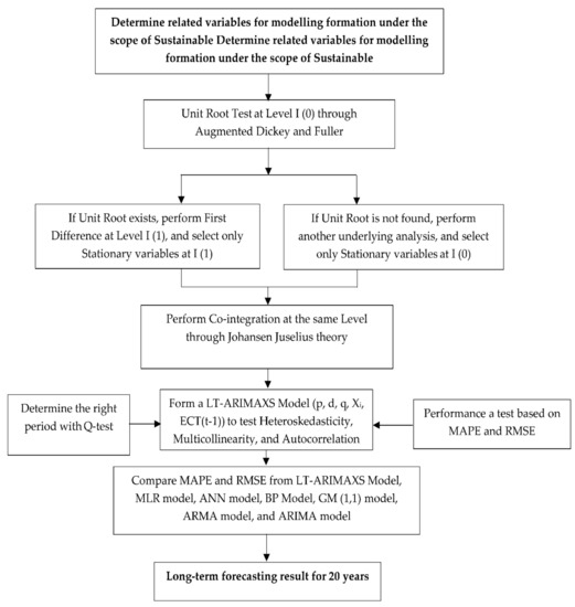 The LT-ARIMAXS model is a newly developed method completed by adapting various concepts from the general models including autoregressive (AR), integrate (I), and moving average (MA). For the variable selection criterion, the variables must only be causal factors or stationary at the same level. The stationary level I(0) or first difference I(1) are used to test the unit root test. With the right variables, we fulfill the criterion. Those variables are put forth for a co-integration test. When they are found to be co-integrated, they are then used in structuring the LT-ARIMAXS model (p, d, q, Xi, ECT(t−1)) with an appropriateness check of period (t − i) through the implementation of a white noise process by the Q test statistic method. In this paper, the LT-ARIMAXS model (p, d, q, Xi, ECT(t−1)) must not be free from heteroskedasticity, multicollinearity, and autocorrelation. Testing the LT-ARIMAXS model (p, d, q, Xi, ECT(t−1)) can be done based with MAPE and RMSE, and comparing those two values with existing models. Once the model is obtained, forecasting the future is the next essential step. We have combined the dataset using Microsoft Office Excel. In addition, EViews 9.5 software is deployed to implement the model, and it flows as below.