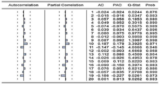 Equation (21) indicates the components of the LT-ARIMAXS model comprised of: (1) Autoregressive variables (AR); (2) Moving Average (MA); (3) exogenous variables (); and (4) error correction mechanism . The LT-ARIMAXS model is built and developed with the assurance of being Heteroskedasticity, Multicollinearity, and Autocorrelation free. There is also an analysis of period identification with the Q-statistics test as to ensure that the model is not spurious while it becomes efficient in the forecasting with fewer errors. The model is then able to be applied in a different context and management policy.