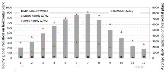 Minimum, maximum and average value for the hourly global radiation on horizontal plane (G—left axis) and average daily radiation on horizontal plane (Gd—right axis) [].