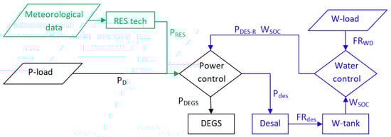 The proposed system models work on a power basis. The developed power control receives information on power demand from the local users (PD), available power from renewable source (PRES), and requested power for the desalination plant (PDES-R), aiming at the complete replenishment of the water storage. The water control receives information about water load (FRWD) and tanks’ state of charge (WSOC), determining the amount of water lacking in storage and the related power request (PDES-R). Hence, the power control compares the power information and defines the effective power supply to the desalination plant (PDES) and the DEGS power need (PDEGS).