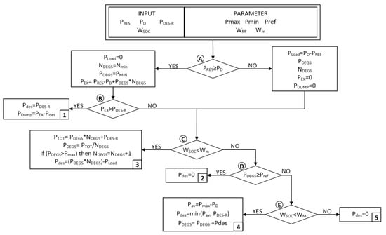 The scheme for the control module is illustrated in Figure 3. The decision process is driven by steps indicated by letters in circles. The five modes’ ends are identified by numbered boxes. The set point is given by the comparison of renewable power availability (PRES), reference power set (PREF), end user power demand (PD) and clean water production schedule given by the water storage state of charge (WSOC) that is intended to be maintained between a minimum (Wm) and a maximum (WM) value.