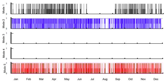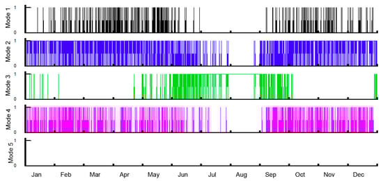 Table 4 and Figure 5 show the results for the operating modes deriving from the control logic application. In the DeReC scenario, the water storage fullness is never concurrent with the possibility to increase the engines’ power set point, hence mode 5 is never engaged. It is evident that mode 2 remains the most frequent situation distributed over the year, with an occurrence of 4453 h and a gap during August. For 2229 h, the system registers a water level less than the fixed minimum (mode 3), conducing to the increase of the active engines’ power independently from the engines’ power set point related to the island power load coverage. Moreover, for 322 h an additional engine is switched on in order to re-establish, at least, the fixed minimum water store. In Figure 5 it can be noticed that mode 3 is the only operation mode active during August, which is the most critical period of the year for water supply in the island. An increase of the initial engines’ power set points for desalination purposes is also registered for 1287 h in mode 4, as the engines’ power is less than the reference power.