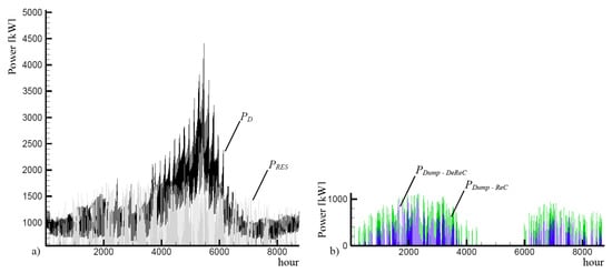 Hourly based curves for (a) user load (PD, black line) and renewable power availability (PRES, grey line) during a reference year and (b) dumped power in the ReC (PDump-ReC, green line) and DeReC (PDump-DeReC, blue line), during a reference year.