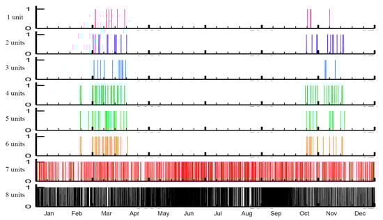 Figure 7 shows the occurrence distribution of the contemporarily active RO units during the year. Most of the time (i.e., 3463 h/year), each of the eight RO units is working. The number of hours in which only seven RO units are simultaneously on duty is 636 h/year. In these two cases, the operations are distributed throughout the year. A different behavior is shown for six to only one active RO units. In these cases, it can be seen that such situations are infrequent with an occurrence ranging from 11 to 45 h, passing from one single unit to six simultaneously active units. Moreover, these cases are focused on two periods of the year, corresponding to high storage fill levels which temporary reduce the need to desalinate water.