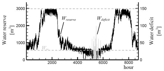 Hourly based curves for water reserve (left axis, black line) and water supply deficit (right axis, grey line) in DeReC during a reference year.