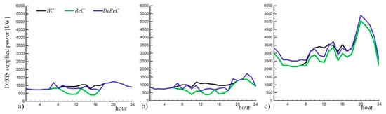 Hourly based curves for DEGS supplied power in BC (black line), ReC (green line) and DeReC (blue line) for three specific days: (a) 4 February, (b) 10 May (c) 16 August.