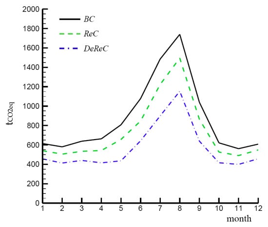 Monthly based curves for equivalent carbon dioxide emissions in BC (solid black line) ReC (dashed green line) and DeReC (dashed-dotted blue line), accounting for water shipping emissions in BC and ReC.