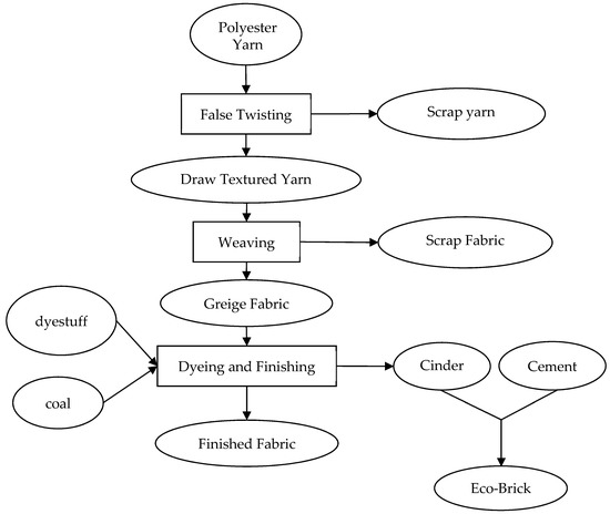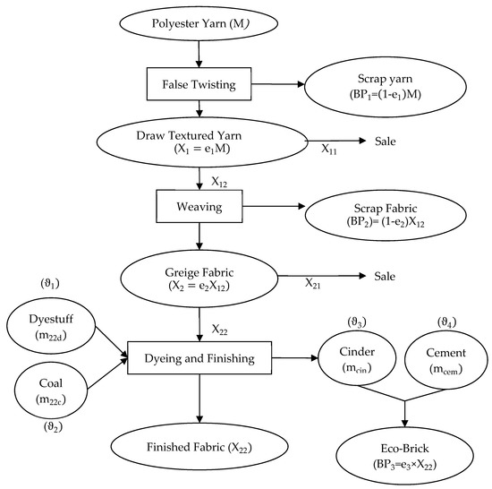 Textile manufacturing process with the symbols of quantity variables mentioned in Equations (20)–(32) is shown as Figure 4.