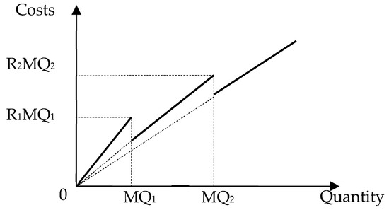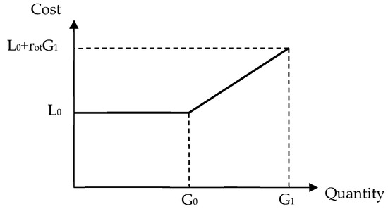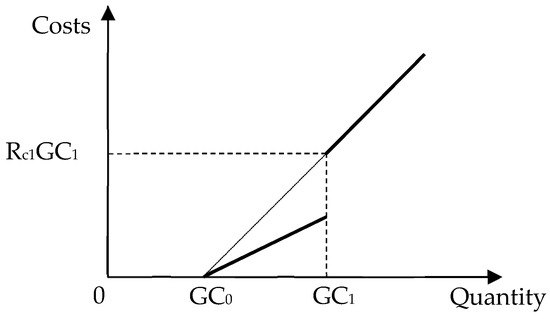 Global warming is an important issue. Reducing the greenhouse effect is a primary concern, and one of the main factors affecting the greenhouse effect is that of carbon dioxide emissions [1,59,60,61]. The textile industry is the one of the major industries guilty of excessive CO2 emissions in global manufacturing, especially in the dyeing and finishing process [62,63,64]. Assume that CO2 emissions are taxed at different rates as a piecewise variable cost as shown in Figure 3. When CO2 emissions are well controlled according to particular criteria, there is free carbon tax in . The standard of the CO2 emissions is , and the tax will be higher than the standard when CO2 emissions exceed GC1 and become . The total carbon tax cost is as shown in Equation (1), and the associated constraints are Equations (13)–(17):