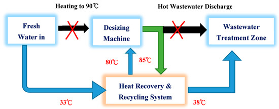 The textile industry, during the dyeing and finishing processes, needs to generate a lot of heat. It generally uses heat from burning coal, steam boilers, and medium heat boilers and heating furnaces. The use of its high temperature and air heat transfer can enhance the combustion air temperature, and reduce the exhaust temperature to achieve waste heat recovery purposes [65,66]. However, the textile industry is also a heavy consumer of water [42]. It is therefore evident that water recycling and reuse is also an important wastewater treatment issue [67]. Heat and water are used mainly in the dyeing and finishing process [68]; thus, energy recycling of heat and water will vary with the production quantity of the finished fabric. The energy recycling cost saving for heat and water are and , respectively, in Equation (1), and the associated constraints are Equations (18) and (19):