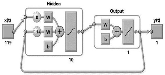 where, the output value yt is a non-linear function of ny previous outputs and nu inputs. This non-linear function is, in our case, a feedforward neural network. Further description of this model can be found in [39]. Figure 1 shows a visualization of this type of networks working online. The figure shows a feedforward neural network with 119 exogenous inputs and a feedback of 14 previous values, 10 neurons in the hidden layer and 1 output.
