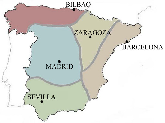 In our case, Spain is a large country with a wide weather diversity. In addition, the population distribution also causes a high variability of power consumption among areas. According to this, the model used at REE includes data from five locations that represent the five weather regions: North-Atlantic (Bilbao), Mediterranean (Barcelona), Upper-Center (Zaragoza), Lower-Center (Madrid) and South (Sevilla). These cities, shown in Figure 2 are the most power demanding areas in each weather region.