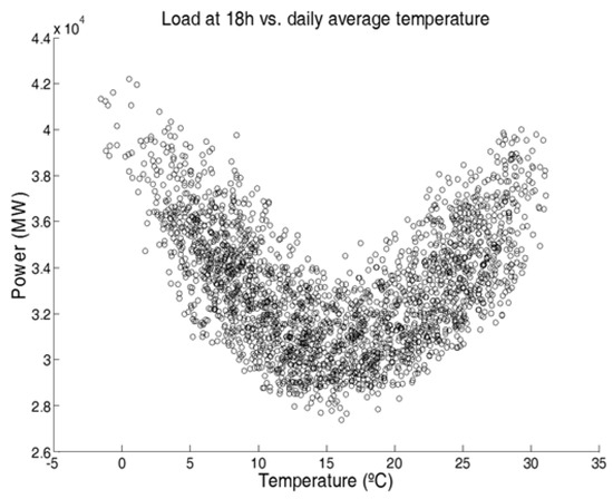 As it was aforementioned, temperature has a non-linear relation with electricity consumption, as both high and low temperature causes an increase in demand. To illustrate this, Figure 3 shows a plot of the average load on regular days at 18 h against the average temperature of the day. Therefore, in order for the forecasting engine to capture such behavior, it may require a pre-processing of the data.