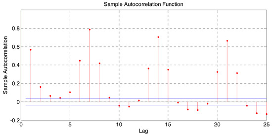 The auto-regressive order of each model has been tested from 0 to 25. The load series is highly self-correlated on lags multiple of seven due to the weekly patterns, as it is shown in Figure 4. Therefore, lags around 7, 14 and 21 were explored. Auto-correlation measures the correlation between yt and yt+k, and its calculation is described in [43].