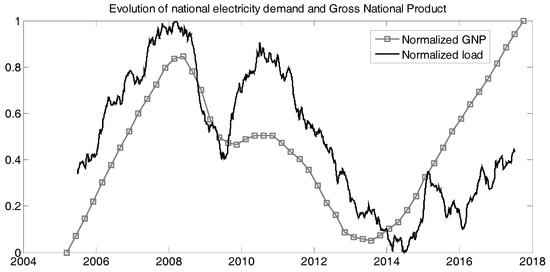 Evolution of 52 weeks moving average load and Gross National Product. Both series are normalized [0, 1].