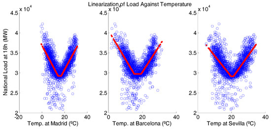 One common approach to this is using a technique called Heating Degree Days (HDD) and Cooling Degree Days (CDD). This technique linearizes the temperature load relation by defining threshold for high and low temperatures and splitting the series into one that accounts for cold days and another that does for hot days. The CDD and HDD series are described in Equations (3) and (4) and they are further discussed in [34].