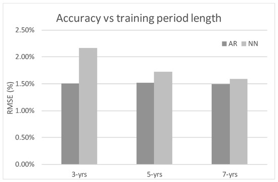 Forecasting error (RMSE) with training periods from 3 to 7 years.
