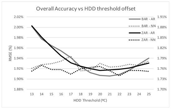 Overall forecasting error (RMSE) with different HDD threshold adjustment in Barcelona and Zaragoza.