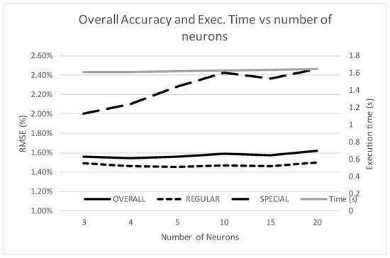 Figure 11 shows the evolution of accuracy and simulation time against the number of neurons in the hidden layer. It can be seen that the execution time is almost constant and therefore the number of neurons is not an issue regarding computational burden. In addition, accuracy on regular days does not improve with more complex networks. Special days, however, show a deterioration as the number of neurons increases. A possible explanation to this is that a more complex network is able to overfit the training data and lose generality. This is especially obvious on the special-day category due to the scarcity of data.