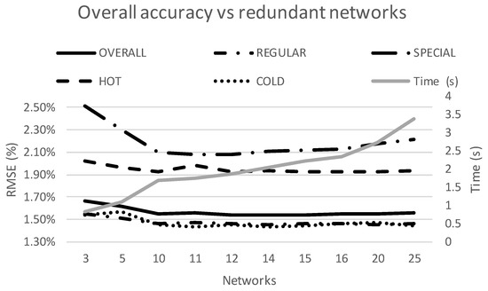 Overall forecasting error (RMSE) and execution time with different redundant networks.