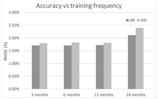 Forecasting error (RMSE) for AR and NN models with training frequency from 3 to 24 months.