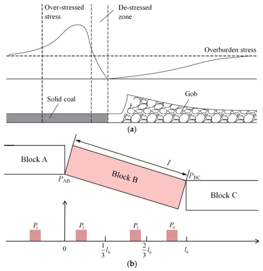 Rationales behind the gob-side entry layout: (a) the destressed zone theory, revised by Yavuz [30]; (b) the cutting cantilever beam theory and gob-side entry locations relative to the cantilever roof block, revised by Feng and Zhang [9]. The symbol lh in Figure 2b is the horizontal distance between point PAB and point PBC of Block B.