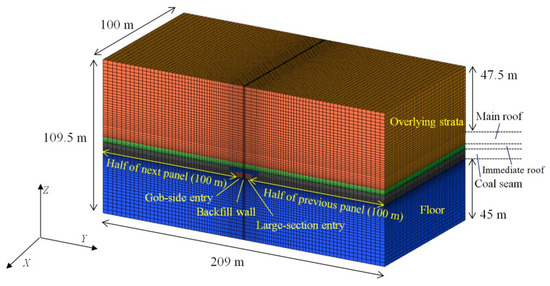 The coal seam at Changcun Mine has a dip angle ranging from 0° to 6° and is assumed to be horizontal in the numerical simulation. Figure 4 shows the numerical model. The model has dimensions of 209 m × 100 m × 109.5 m. The coal seam average thickness is 6.1 m with a mining height of 3.2 m. Both the large-section entry (Figure 3a) and the gob-side entry (Figure 3d) have dimensions of 4.5 m (in width) × 3.5 m (in height). The artificial rib pillar is assumed to be continuous along the strike length of the longwall panel in the numerical simulation.