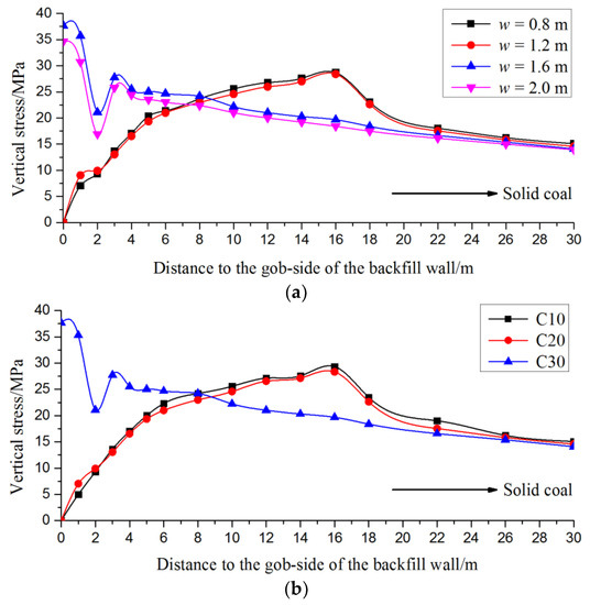Effects of backfill wall widths and concrete strength on backfill wall stability after the previous panel retreating: (a) vertical stress distributions with different backfill wall widths (C30 concrete is used); (b) vertical stress distributions with different concrete strength (artificial rib pillar width is 1.6 m).
