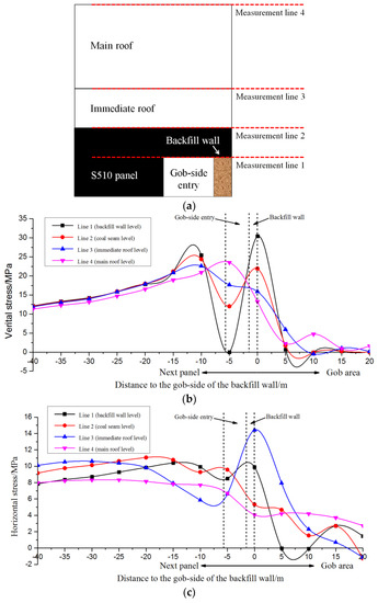 Stress distributions after the gob-side entry development. The value 0 in each horizontal axis in Figure 6b,c is at the right side of the backfill wall (the side close to the gob area) in Figure 6a: (a) measurement lines used in the numerical simulations to record the simulated stresses; (b) vertical stress distributions along the measurement lines; (c) horizontal stress distributions along the measurement lines.