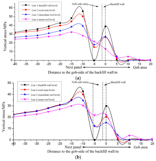 From the field monitoring at previous longwall panels at Changcun Mine, the working face first weighting interval is about 37.8 m [42]. In the numerical simulation, the retreating distance of the next panel is assumed to be 40 m without gob materials filling the gob area. The vertical stress distributions along Lines 1 to 4 (Section 3.3) 5 m and 15 m ahead of the working face are investigated respectively.