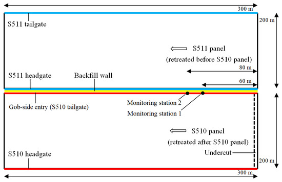 Two monitoring stations are arranged in the gob-side entry. Station 1 and Station 2 are located 60 m and 80 m ahead of the undercut respectively (Figure 8). The field monitoring aims to measure the following data during the retreating of Panel S510: