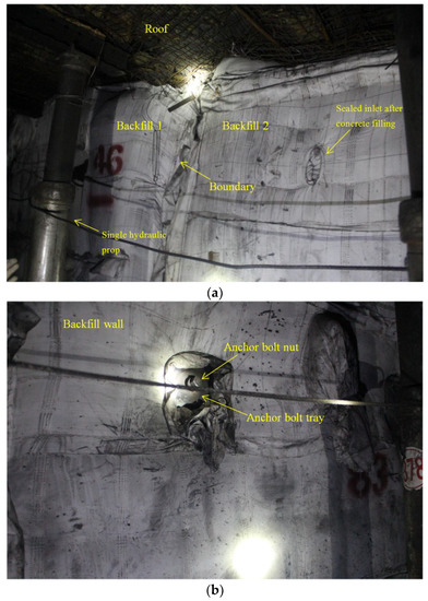 Gob-side entry condition during next panel retreating: (a) backfill wall side condition; (b) roof condition.