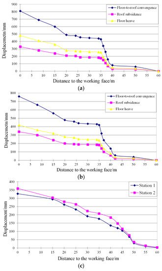 The entry side displacements recorded from Stations 1 and 2 are superimposed in Figure 11c for comparison. The side deformation at each station shows the same tendency. The side displacements at Stations 1 and 2 begin to increase notably once the working face to station distance is 50 m and arrive at the final maximum values of 328 and 360 mm respectively.