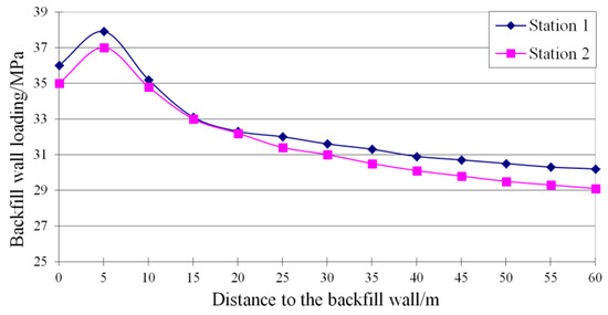 Stress gauges are embedded in the top surface of the artificial rib pillar at each monitoring station to record the artificial rib pillar loading during S511 panel retreating. The compressive stresses applied to the artificial rib pillar at Stations 1 and 2 are superimposed in Figure 15. The compressive stresses monitored at both stations increase gradually with panel retreating and reach the maximum magnitudes of 37.9 MPa (Station 1) and 37 MPa (Station 2) respectively when the working face to station distance reaches about 5 m. Then the loading forces decreas slightly to 36 MPa (Station 1) and 35 MPa (Station 2) respectively.