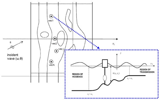 We consider here the hydrodynamic problem concerning the behavior of a number N of identical cylindrical-shaped WECs, , of characteristic radius a and draft d, operating in the nearshore environment, as shown in Figure 1.
