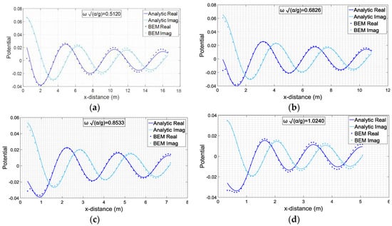 where and satisfies the linearized water wave equations; see []. In the above equation is the incident wave height, g is the acceleration due to gravity, is the frequency parameter, and . The free surface elevation is then obtained in terms of the wave potential as follows: