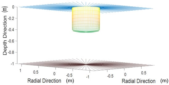 A cylindrical heaving WEC is widely used in offshore installations of the devices for harnessing wave energy []. The numerical treatment of the wave-body interaction problem by means of BEM, described in this study, constitutes from three separate regions, namely the free surface, the body of the WEC and the bottom. Appropriate mesh generation in all these surfaces is crucial for obtaining reliable solution. For this purpose, the free surface is discretized in 4 × (N/λ) × 88 elements, expanding for 4 wavelengths, where the first number indicates discretization along the radial direction and the other along azimuthal direction, respectively, while the bottom mesh is 26 × 88 elements, spatially and azimuthally respectively. The WEC mesh is 10 × 88 elements, in depth and in azimuthal direction, as illustrated in Figure 4. It should be noticed the demand for consistency between the lengths of the elements, those of the WEC and these of the free surface, at the matching position of the body’s boundary. Very fine meshes only on the body and not on the free surface, which binds most of the computational capacity and therefore has its limitations, may cause worse approximation of the analytic solution on account of inconsistency.
