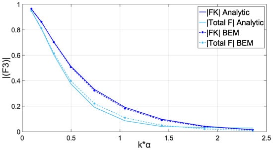 Focusing on the power output coming from a single device, the first step for its calculation is the evaluation of the Froude-Krylov and total forces, which are the summation of Froude-Krylov and Diffraction forces, and the related hydrodynamic coefficients of added mass and damping. In Figure 5 and Figure 6 are illustrated the results for these aspects, as they calculated both from the analytical and the numerical treatment of the problem ([,]).