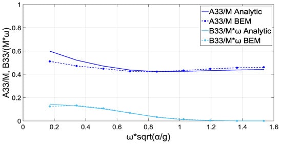 where denotes Kronecker’s delta and M is the body mass (assumed the same for all WECs). The hydrodynamic coefficients (added mass and damping) are calculated by the following integrals: