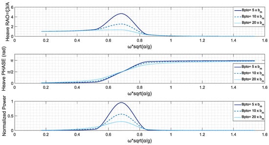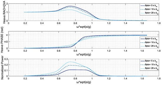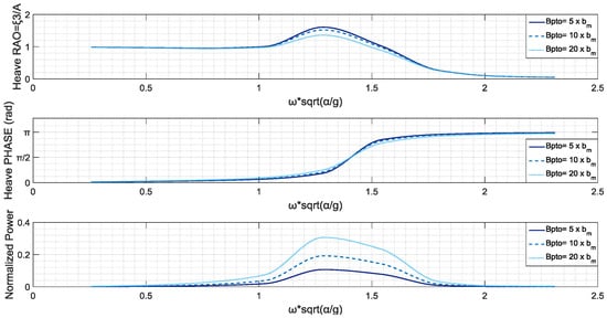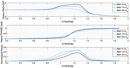 Furthermore, the WEC responses and the power output are evaluated and plotted in Figure 7, assuming typical PTO damping values, equal to 5, 10 and 20 times a mean value of hydrodynamic damping bm. This value is estimated as , where the resonance frequency is , also described in [].